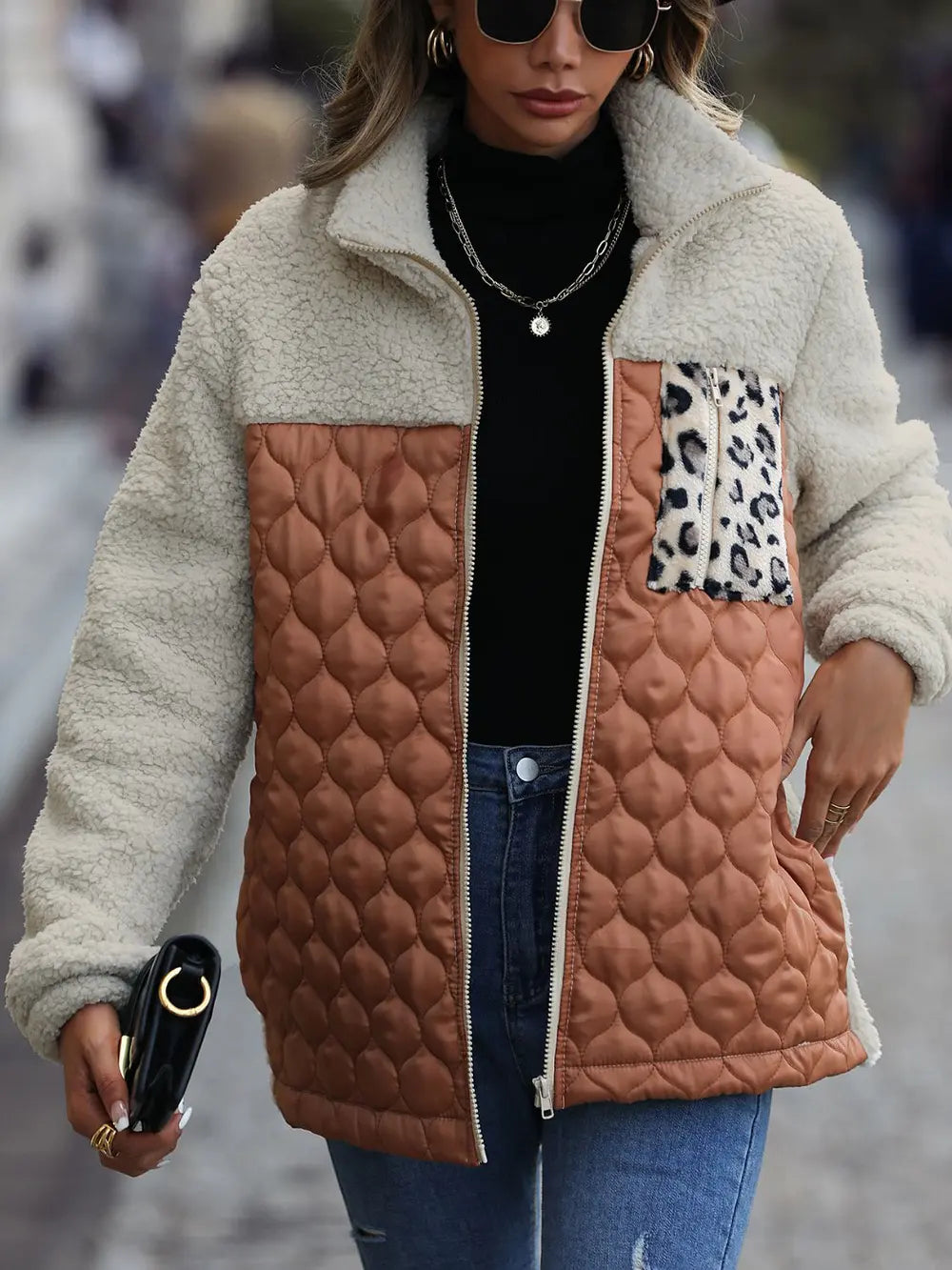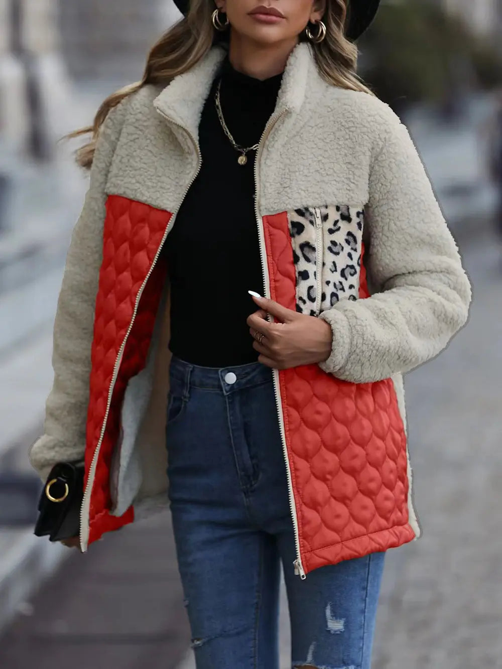 Leopard Color Block Zip-Up Winter Outfits Jacket